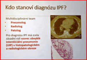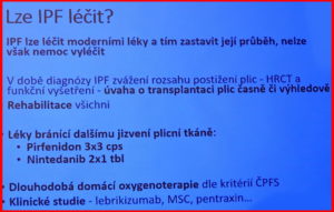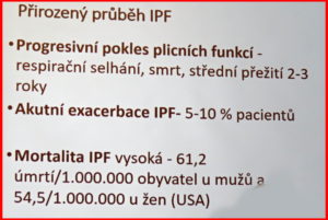 Zákeřná a nenápadně začínající plicní nemoc ročně v České republice usmrtí desítky pacientů. Poškozuje plicní sklípky, zajizvuje je, plíce tuhnou a takto nemocný se nemůže nadechnout. Pokud je onemocnění diagnostikováno včas a je nasazena léčba, může pacient vzdorovat roky a zvyšuje se jeho šance, že se dočká transplantace plic. Při objevení nemoci v pokročilém stádiu už léčbu nejde nasadit. Bez ní IPF obvykle zabíjí do tří let.