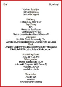 Pedagogové katedry výchov uměním PF UJEP v Ústí nad Labem si Vás dovolují pozvat od pátku 23. února 2018 na výstavu Drei Blickwinkel / Tři úhly pohledu v Kulturmodell v Pasově/ Německo.