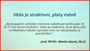 „Nastupujícím učitelům můžeme nabídnout tarifní plat 23 až 27 tisíc korun hrubého. Takže je evidentní, že jít dnes učit na lékařskou fakultu opravdu není nic lukrativního či prestižního,“ podtrhuje děkan Bareš, který je také místopředsedou Asociace děkanů lékařských fakult ČR.
