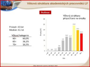 Jak ukazují data lékařských fakult (viz grafy níže), docentům je průměrně 55 let, celkem 41 % z nich je starších 60 let a 14 % je více než 70 let. Průměrný věk profesorů je 63 let, 60 % je starších 60 let, nad 70 let je téměř 17 procentům.
