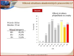Jak ukazují data lékařských fakult (viz grafy níže), docentům je průměrně 55 let, celkem 41 % z nich je starších 60 let a 14 % je více než 70 let. Průměrný věk profesorů je 63 let, 60 % je starších 60 let, nad 70 let je téměř 17 procentům.