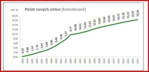 První úvěry si lidé sjednali v roce 1995, o 10 let později už jich bylo přes milión a roku 2012 milióny dva. „Pozdější začátek úvěrování není náhodný – stavební spořitelny půjčují pouze reálné peníze. Musely tedy nejprve získat vklady od klientů, kteří spořili, až poté je mohly začít půjčovat,“ říká tajemník AČSS Jiří Šedivý. Vývoj smluv i úvěrů ukazují následující grafy: