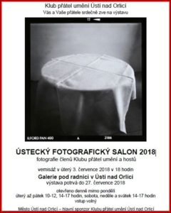 Srdečně Vás zveme do Galerie pod radnicí v Ústí nad Orlicí na výstavu „Ústecký fotografický salon 2018“, která bude zahájena v úterý 3. července v 18 hodin a potrvá do 27. července 2018.