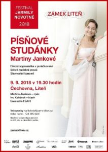 Písňovým recitálem jedné z našich nejzářivějších sopranistek Martiny Jankové dospěje do finále 7. ročník Festivalu Jarmily Novotné. Pěvkyně s průzračným sopránem vystoupí v neděli 9. září při slavnostním koncertu s názvem Písňové studánky Martiny Jankové v barokní budově Čechovny v areálu zámku Liteň. Podobně jako kdysi věhlasná Jarmila Novotná podporovala zpěvem svou vlast, navrátí se sopranistka žijící ve Švýcarsku do své domoviny, aby jí v moravské i janáčkovské lidové hudební poezií složila svou poctu. Její vystoupení bude současně symbolickou oslavou skladatele Leoše Janáčka, jehož 90. výročí úmrtí připadá právě na letošek. Po boku Martiny Jankové se rovněž představí žádaný klavírista Ivo Kahánek spolu s folklórním tělesem Ensemble FLAIR.