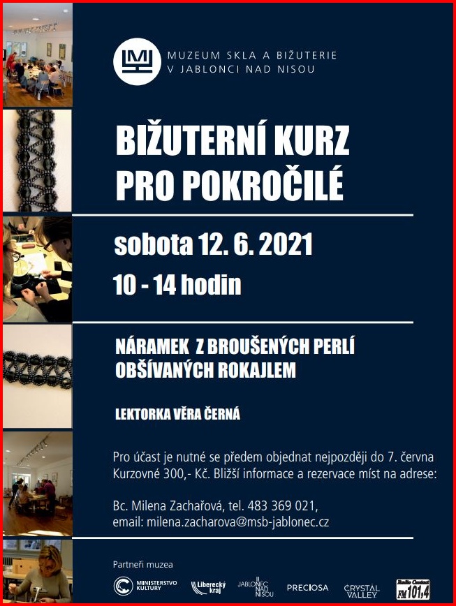 Předem objednaní zájemci se tentokrát naučí vyrobit náramek a náhrdelník z broušených perlí obšívaných rokajlem. Kurz povede tradiční lektorka Věra Černá a je vhodný zejména pro mírně pokročilé dospělé. „V roce 2020 jsme byli nuceni všechny naplánované kurzy zrušit. Letos doufáme, že si je návštěvníci užijí více“, informuje muzejní edukátorka Milena Zachařová.