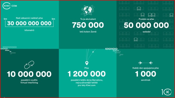 Za uplynulých 10 let Kiwi.com prodalo před 50 milionů sedadel, vytvořilo 10 milionů virtuálně propojených letů a jeho zákazníci nalétali 30 miliard kilometrů. Více než 1,2 milionu pasažérů letělo přes Barcelonu, nejnavštěvovanější letiště zákazníků Kiwi.com. Oblíbené Thajsko navštívilo přes 90 tisíc baťůžkářů, ovšem absolutní rekord drží neznámý pasažér, který cestoval s 36 zavazadly.