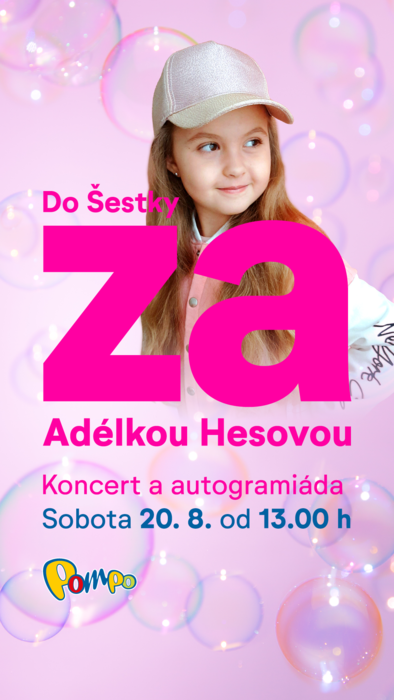 Protože je Adélka Hesová blázen do růžové, bude v sobotu 20. srpna od 13:00 dominovat pódiu před POMPEM v OC Šestka právě tato roztomilá barva. Těšit se můžete zhruba na 20minutový koncert plný písniček o zvířátkách, mašince, strašidýlku a podobně, který zakončí autogramiáda této šikovné dětské hvězdy. A kdo bude chtít, může se společně s Adélkou vyfotit.