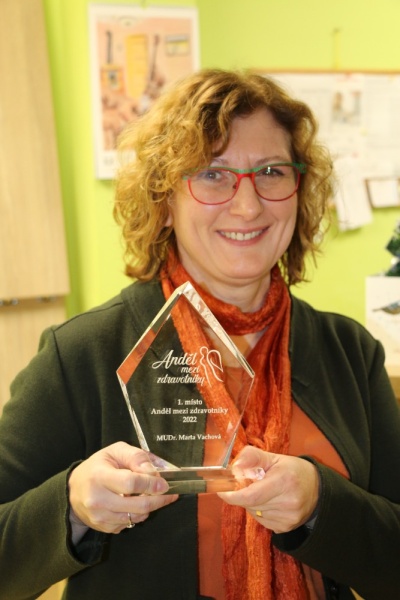 Ředitel soutěže Anděl mezi zdravotníky předal Martě Vachové skleněnou plaketu, na které je vyryto jméno letošní vítězky. Cena zaujala čestné místo na okně v pracovně paní primářky. „Plaketu měli paní doktorce předávat Lucie Bílá a Jiří Korn na akci v Praze u PVZP. Paní Vachová neměla čas. Pak jsem ji chtěl předat na Pražském hradě, to se přiznám, zapomněl jsem ji doma. Tak konečně, do třetice, předávám plaketu její držitelce. Je to taková pomyslná tečka za letošním ročníkem a už chystám další. Chytrých, šikovných a obětavých zdravotníků, pečovatelů, farmaceutů, záchranářů a pracovníků v sociálních službách máme kolem sebe hodně. Těším se na ně a se svým týmem se vynasnažím, aby Anděl mezi zdravotníky 2023 byl opět úspěšný,“ uvedl David Novotný a Kateřina Zemanová ho ujistila: „Byla jsem patronkou soutěže už třikrát a jsem za tu šanci vděčná. Je to soutěž, která je úzce spjatá s Nadačním fondem Miloše Zemana a vždycky ji ráda podpořím. Spolupráce je navázaná a chceme v tom pokračovat.“