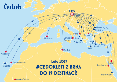 „Aktivita stabilního hráče na trhu, cestovní kanceláře Čedok, je dalším atraktivním oživením trhu s nabídkou leteckých spojení do dovolenkových destinací z Brna. Jsme rádi, že počet plánovaných destinací, ze kterých si mohou cestující vybírat, se tímto opět rozrůstá. Těší nás také zájem cestujících o nové a znovuzavedené destinace, a tak již nyní letošní letní sezónu s nadšením očekáváme a pilně se na ni připravujeme,“ doplnil Radek Lang, Airport Services Manager, LETIŠTĚ BRNO a.s.