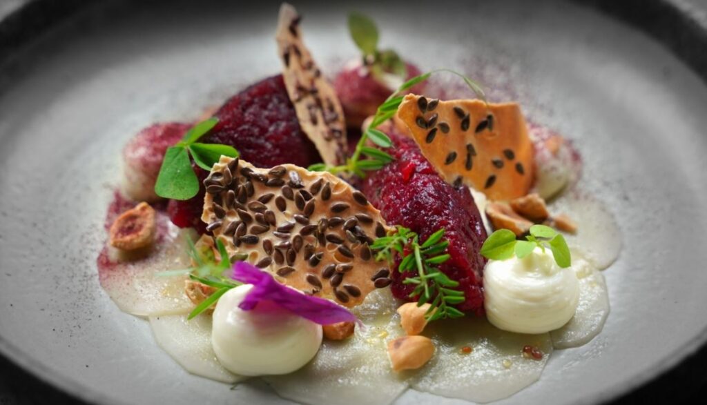 A co bude v oblacích vařit? Jako předkrm připraví uzeného lososa s podmáslím a okurkou, poté bude následovat teplý předkrm v podobě lanýžové sedliny s Mattoni a s koprovým krémem a jako hlavní chod bude šéfkuchař servírovat pečené hovězí s konfitovanou bramborou, puré z černého kořene a s hovězí omáčkou. Na talíři pro vegetariány nahradí lososa uzené tofu, zatímco v hlavním chodu se místo hovězího bude podávat pečený tempeh. Dezert už bude pro všechny stejný, je inspirovaný dortem Pupp a ja to čokoládový dort s meruňkovým kaviárem a kokosem.