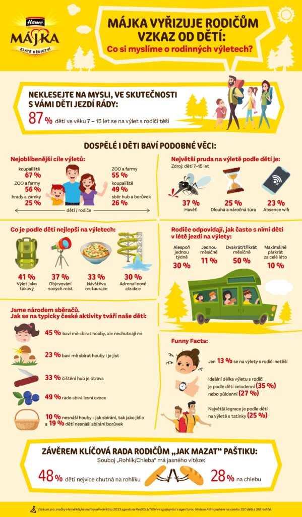 Prázdniny klepou na dveře a s nimi rodinné výlety. Děti sice někdy dělají otrávené obličeje a vypadá to, že by radši seděly doma u mobilu nebo počítače. Ve skutečnosti to ale není tak špatné – na společné výlety se těší 87 % z nich! A co na výletech podniknout? Naštěstí děti i rodiče říkají, že mají rádi podobné aktivity. Jednoznačně vítězí koupání, následuje návštěva různých zoo a farem, na třetím místě jsou hrady a zámky. A čemu byste se vážení rodiče měli vyhnout, protože to děti naopak spolehlivě otráví? Dětem nejvíc vadí „havěť“. Takže pozor na mouchy a komáry! Na druhém místě „neoblíbenosti“ jsou dlouhé a náročné túry. A jak mazat na výlet svačinu s paštikou? Odvěký souboj má jasného vítěze: Májku na rohlíku chce dvakrát víc dětí než na chlebu. Tradiční paštika Májka se na Moravě vyrábí už víc než 55 let. Nezapomeňte si ji přibalit do batůžku!