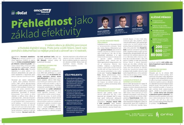 Případová studie společnosti Onlio odborníky zaujala zejména tím, že zcela konkrétně popisuje přínosy zavedení document management systému do firmy. Ocenila tak řešení, které umožnilo společnosti Oncomed díky DMS eDoCat efektivně spravovat řízení přístupu k firemní dokumentaci v oblasti projektového řízení a personalistiky. „Získaného ocenění si nesmírně vážíme. Je pro nás dalším potvrzením toho, že se nám podařilo vytvořit software s vysokou užitnou hodnotou, jehož přínosy naši zákazníci vnímají velmi pozitivně. Proto dokáže uspět na trhu nástrojů určených k digitalizaci firemních procesů. Vnímáme ho ale také jako ocenění za to, že jsme našim zákazníkům spolehlivými partnery v procesu zavádění systému do firmy,“ uvedl Pavel Nykl.