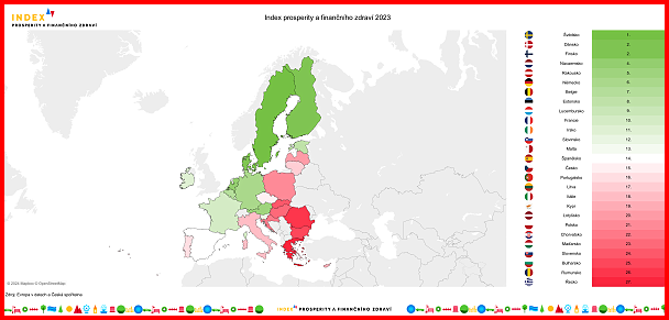 V prvním ročníku Indexu prosperity a finančního zdraví skončilo Česko na průměrném 13. místě v eurounijním srovnání. Datová analýza ukázala nejen na silné stránky českého prostředí jako je zdravotnictví a bezpečnost či solidarita ve společnosti, ale i na rezervy, se kterými se Česko musí vypořádat. Ačkoliv meziročně došlo v řadě indikátorů k pozitivnímu posunu a zlepšení, v celkovém pořadí jsme se o dvě místa propadli. Na vině propadu pod průměr EU je především pokles v oblasti ekonomiky či vzdělání a výzkumu.