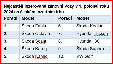 Zánovní automobily jsou v české inzertní nabídce nejvíce ve variantě SUV (42,8 %), hatchback (25,1 %) nebo kombi (16,4 %). Nejčastěji jde pak o značku Škoda s modely Fabia (5,9 %), Octavia (4,2 %) nebo Scala (3,9 %). Většina nabízených zánovních aut má benzínový motor (61,8 %), ale významně vzrostla nabídka alternativních paliv. Poslední pololetí mohli Češi vybírat z téměř dvojnásobného množství zánovních, čistě bateriových vozů (konkrétně 1 643) a hybridů (2 730) než o pololetí dříve. Z elektromobilů je nejvíce inzerovaná Škoda Enyaq a z hybridů Toyota Corolla.