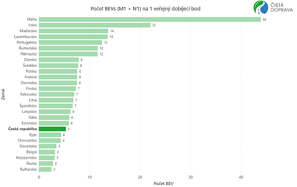 V zemích Evropské unie je provozováno 786 813 veřejných dobíjecích bodů, v Česku pak 5 482. Téměř šest z deseti, přesněji 58,4 % veřejných dobíjecích bodů, je k dispozici ve třech zemích EU: v Nizozemsku 21,4 %, v Německu 18,5 % a ve Francii 18,4 %. Uvedených téměř 5,5 tisíce veřejných dobíjecích bodů nás mezi zeměmi EU řadí na 18. místo v přepočtu na počet obyvatel, 19. místo pak v přepočtu na délku silniční sítě. V zemích EU připadá v průměru 6,7 bateriových elektrických vozidel (kat. M1 + N1) na jeden veřejný dobíjecí bod, v Česku je tento podíl 5,3, v ostatních zemích V4 pak: 13,7 v Maďarsku, 7,6 v Polsku a 3,5 na Slovensku. Ze všech provozovaných veřejných dobíjecích bodů v Česku bylo 3 955 běžných (72,1 % AC), 1 150 výkonných s rychlým dobíjením (21,0 % DC do 149 kW) a 377 vysoce výkonných s velmi rychlým dobíjením (6,9 %).
