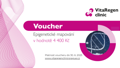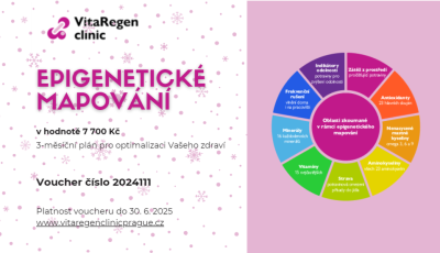 A dodává, že pomalé stárnutí není jen o kráse a obdivuhodném vzhledu, ale také právě o zdraví. I proto VitaRegen clinic Prague přichystala dárkové poukazy, které mohou najít své místo pod vánočním stromečkem. Vybírat lze z voucheru na epigenetické mapování v hodnotě 4 400 Kč, jenž nyní pořídíte se zvýhodněním za 3 499 Kč, nebo voucheru, který kromě samostatného epigenetického mapování s interpretací přidává ještě tříměsíční plán pro optimalizaci zdraví a vitality v hodnotě 7 700 Kč, nyní za zvýhodněnou cenu 5 499 Kč.