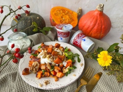 6. Servírování: Opečenou dýni podávejte horkou. Na talíři doplňte nasekanými vlašskými ořechy, polníčkem a hlavně bílým jogurtem, který pokrmu dodá příjemnou svěžest. Nakonec můžete vše jemně zakápnout olivovým olejem pro extra chuť.