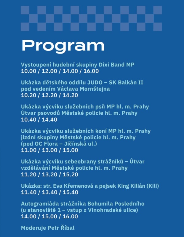 Pro děti je připraven skákací hrad a malování na obličej, zatímco starší návštěvníci si mohou vyzkoušet simulátor nárazu BESIP. Na místě budou také statické ukázky techniky Městské policie, včetně nových vozidel a speciálního vybavení. Celým dnem vás provede moderátor Petr Říbal.