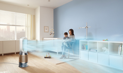 Integrovaným zvlhčovačem – např. Dyson Purifier Humidify, který zároveň zvlhčuje i čistí vzduch a má uzavřený systém bez úniku zachycených alergenů