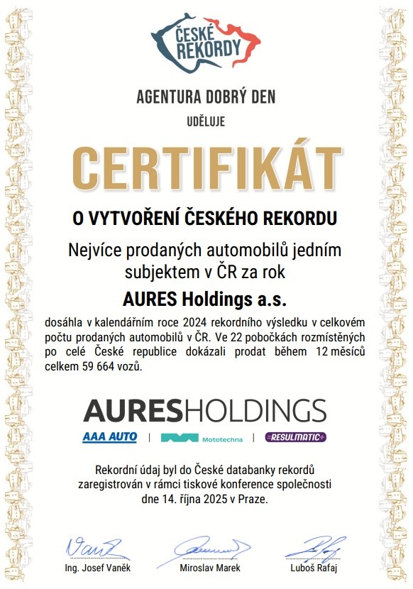 Zájem zákazníků potvrzuje i nový zápis do České knihy rekordů agentury Dobrý den. Síť AAA AUTO a Mototechna v loňském roce podle agentury prodala historicky nejvíce vozů ze všech prodejců na tuzemském trhu, a to 59 664 aut. Příslušný certifikát byl zástupci agentury předán společnosti na dnešní tiskové konferenci.