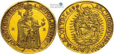 5dukát 1669, který se jen výjimečně objevuje mimo trezory, nese všechny znaky reprezentativní ražby své doby. Na lícní straně je zobrazen císař Leopold I. stojící v brnění a plášti, s korunou, mečem, žezlem a říšským jablkem, tedy se všemi znaky panovnické moci. Rubová strana nese jemně zpracovaný motiv Madony na půlměsíci se svatozáří, korunou a dítětem v náručí, obklopený plamennou gloriolou. Značka K–B potvrzuje její kremnický původ. Vyvolávací cena mince je 150 000 €. Tento exemplář patří mezi vrcholná díla habsburské ražby a světové numismatiky. „Je to mimořádně vzácný exemplář, který si získal pozornost veřejnosti na dvou velkých událostech. Nyní se v aukci otevírá příležitost pro sběratele zařadit jej do špičkové sbírky,“ říká Elizej Macho, spoluzakladatel aukčního domu Macho & Chlapovič.