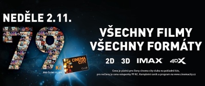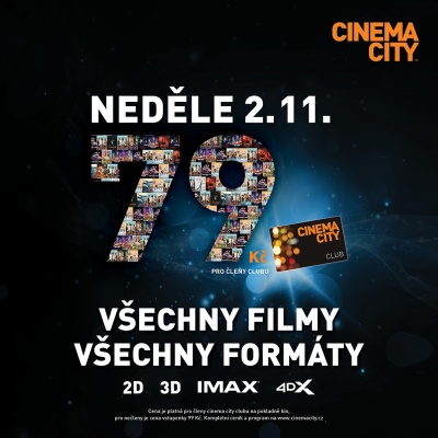 Levná neděle proběhne v neděli 2. listopadu 2025 ve všech multiplexech Cinema City po celé České republice. Staňte se členem Cinema City Clubu a získejte přístup k dalším výhodám, slevám a speciálním akcím. Díky členství navíc budete mít přehled o všech filmových novinkách i jedinečných událostech ze světa kina jako první. Více na www.cinemacity.cz