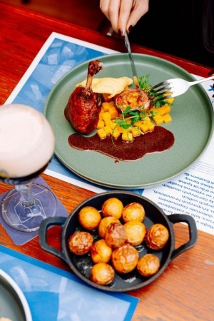Husa nebo kachna? Obě mají svoje kouzlo. Husa je slavnostnější, větší a ideální pro velkou rodinu nebo přátele kolem jednoho stolu. Kachna je menší, dostupnější a tak akorát pro čtyři strávníky. Společné ale mají jedno – pořádnou dávku trpělivosti, sůl, kmín a křupavou kůži, bez které by listopad nebyl listopadem. „Kachnu pořádně nasolte a nakmínujte zvenku i zevnitř. Dovnitř dejte celý svazek saturejky, přiklopte a pečte asi dvě hodiny zakryté. Pak odklopte a dopékejte ještě hodinu, ideálně s občasným otočením, aby se kůže propekla dozlatova,“ radí Oldřich Matoušek, šéfkuchař restaurace Bruxx. Právě tady kachnu letos povýšili na hlavní hvězdu svatomartinského období. Na menu najdete pomalu pečené kachní stehno s nádivkou z vepřového masa, kuřecích jater a bylinek podle Paula Bocuse, doplněné bramborami na másle a jemnou omáčkou s koňakem, kterou flambují přímo před hostem. A jestli se chcete rozmazlit ještě víc, sáhněte po tradiční francouzské paštice v máslovém těstě s želé z masové šťávy a nakládanou zeleninou. Kdo chce letos spojit svatomartinskou tradici s kapkou francouzské elegance a sklenkou belgického piva, měl by zamířit právě sem.