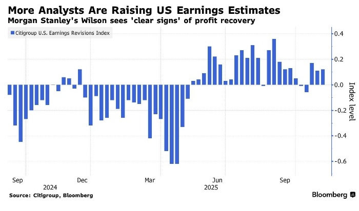 Michael Wilson zo spoločnosti Morgan Stanley zaznamenal „jasné známky“ oživenia ziskovosti a zlepšenia cenovej sily amerických spoločností. Poznamenal tiež pokles revízií prognóz ziskov, čo sa prejavilo v nižšom pomere analytikov, ktorí svoje odhady prešli skôr horšie ako horšie.