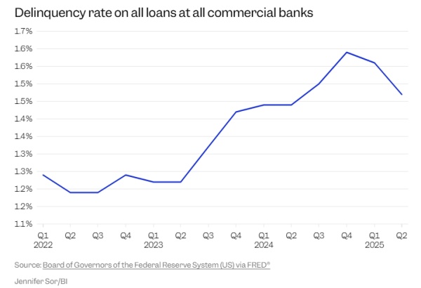 Ekonomika vykazuje aj ďalšie známky problémov dlžníkov. Úroveň oneskorených dlhov na všetkých úveroch v komerčných bankách sa za posledné dva roky neustále zvyšuje.