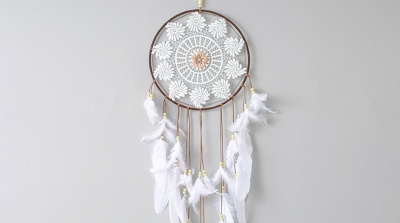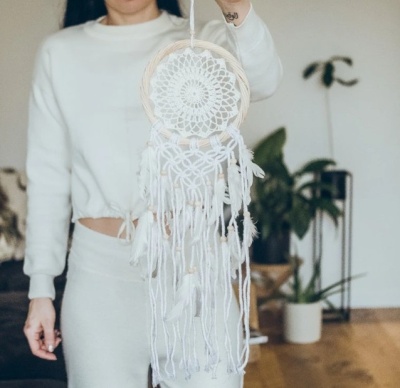 Elegantní lapač snů v bílé barvě s dřevěnými korálky a jemnými bílými peříčky přinese do vašeho domova útulnou a harmonickou atmosféru. Je ideální nad postel, kde plní svou tradiční roli – pomáhá odhánět noční můry, zároveň však slouží i jako krásná dekorace, která zútulní každý kout místnosti.