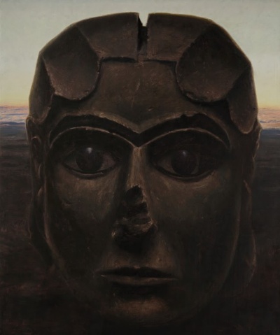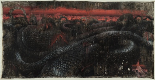Kašparova malba tematizuje sumerskou bohyni Inannu a mytického draka, bytost starší než svět, představitelku praoceánu, instinktivního světa a ženského principu, který v sobě spojuje plodnost i destrukci. V jeho velkoformátovém díle se drak metamorfuje v horu, šupiny v geologické vrstvy, krajina v organismus, v němž se smrt zrcadlí v zrození. Inanna s kopím stojí proti této pradávné tvořivosti, nikoli v gestu absolutní destrukce, ale v okamžiku přerodu; „drakobijectví“ symbolizuje vznik lidského vědomí, okamžik, kdy se temná samozřejmost světa obrací v rub. Adam Kašpar přitom nepracuje s romantickou představou návratu k přírodě; jeho malba tematizuje nemožnost takového návratu, jak sám zdůrazňuje: „Jsme přírodnímu světu brutálně a nenávratně odcizeni vznikem vědomí. Je to já, kdo jsem já, a ty, kdo jsi ty. Žádný návrat nenabízím, jediná cesta vede vpřed.“