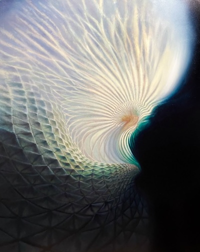 Uldrychova malířská genealogie vyrůstá z téhož archetypálního horizontu, ale překládá jej do jiného jazyka. Jeho praoceán je tvořen posvátnou geometrií, psychedelickými vzory a ornamentem, který není měřením, ale rytmem světa. Nekonečný rastr se táhne do dálky, za obzor, směrem k první hvězdě a k mystériu prvotního světla. Tento dokonalý vzor narušuje ještěří pohyb – jemný, ale zásadní moment, v němž se harmonie obrací v dynamiku a struktura je znovu vystavena zrození. Jan Dotřel k tomu uvádí: „Oba autoři pracují s principem, v němž se dvě odlišné síly vzájemně vyžadují. Každá dokonalost potřebuje své narušení, jinak není šance zrodu.“ Uldrychova pozice tak stojí v opozici k dramatické naléhavosti Kašpara; jeho práce nabízí spíše možnost orientace, přijetí a průvodcovství napříč prostorem, který není ani čistě přírodní, ani čistě duchovní, ale propojuje fyzické tělo, archetypální paměť i symbolickou strukturu.
