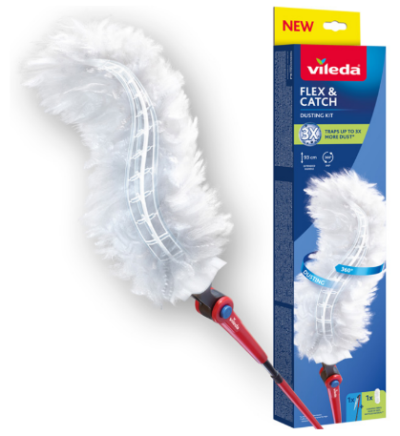 Vileda Flex&Catch s krátkou nebo dlouhou teleskopickou rukojetí se prodlouží až na 93 cm. Umožňuje tak univerzální a efektivní úklid, zatímco technologie spolehlivého upevnění prachovky díky háčku zajišťuje nepřerušovaný úklid. Hlavice prachovek je 3x více flexibilní než tradiční prachovky, umožňuje utírat prach i na těžko přístupných místech. Náhrada je speciálně potažená měkkými a nadýchanými vlákny. Ta rovnoměrně obklopují celou hlavici, takže jde o 360° náhradu, která se na prachovku snadno navleče a zajistí háčkem. Cena prachovky je 143 Kč nebo teleskopická za 232 Kč.