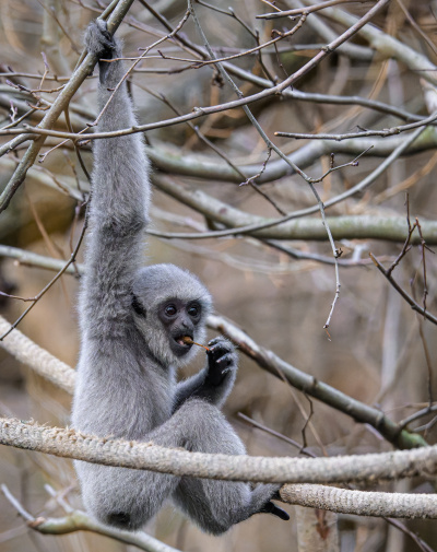 U ročního gibona už dominuje pevná strava. Nejvíce mu chutná klíčené mungo nebo hrách – stejně jako ostatním. V příštích měsících ho čeká postupné osamostatnění. Tím také bude mládě přicházet o automatická privilegia, která mu poskytuje matka, u gibonů stříbrných nejvýše postavené zvíře ve skupině. O nejlepší kousky potravy nebo oblíbenou větev se bude muset zasadit sám.