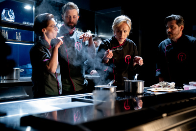 „Asi pokaždý, když vařím, tak je to trošku kuchařskej trapas,“ přiznává s úsměvem Votja Kotek. A není to jen falešná skromnost, na place nové komedie Když se zhasne se ukázalo, že v kuchyni je opravdu bezpečnější nechat práci na profesionálech. „Největší rozdíl je asi ten, že když vařím v reálu, tak to fakt musím udělat já. A tady ve filmu mám profíky a jenom se tvářím, že to dělám já. Moje prsty natáčení vydržely možná i díky tomu, že vždycky, když mělo dojít na nějakou manipulaci s horkou vodou, tak všichni volali: ‚Jdi od toho, jdi od toho,'“ vzpomíná herec na natáčení v olomouckém Telegrapfu, který se pro účely filmu proměnil v zážitkovou restauraci „7 hříchů“ se sedmichodovým menu sestaveným Oldřichem Sahajdákem, michelinským šéfkuchař a chef patron La Degustation Bohême Bourgeoise a jejího sesterského podniku Marie B.