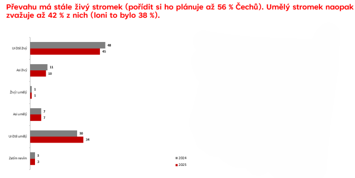 Zajímavostí je, že na popularitě získávají umělé stromky – letos je zvažuje až 42 % Čechů, zatímco loni to bylo 38 %. K umělým stromkům se hlásí především jedno a dvoučlenné domácnosti (43 %), lidé ve věku 54 až 65 let (43 %) a obyvatelé Moravskoslezského kraje (40 %). Finanční výhodnost jejich koupě vyzdvihují zejména lidé z obcí s 1 až 20 tisíci obyvateli (77 %), ekologický aspekt nejčastěji zmiňují lidé ve věku 54 až 65 let (61 %) a časovou úsporu oceňují především obyvatelé Moravy (68 %) a muži (63 %). Praktičnost a ekologie nejsou slova, která by se tradičně spojovala s Vánocemi, ale moderní doba přináší nové hodnoty. Umělý stromek může být stejně krásný jako živý – a navíc šetří čas i přírodu.