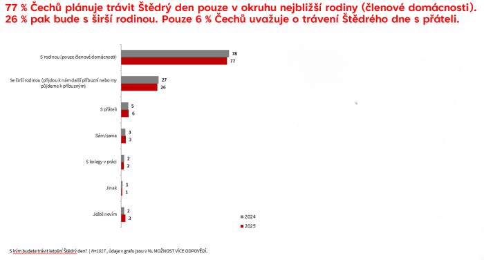 Vánoce jsou pro Čechy především o rodině a domově. Podle aktuálního průzkumu společnosti Home Credit plánuje naprostá většina Čechů trávit Štědrý den v Česku – zahraniční pobyt v tomto termínu zvažují pouhá 4 % respondentů. Více než tři čtvrtiny Čechů stráví nejdůležitější večer roku v kruhu nejbližší rodiny, tedy pouze s členy domácnosti, 26 % se sejde se širší rodinou. Zajímavé je, že s rodinou plánují strávit Štědrý den nejčastěji mladí lidé ve věku 18 až 26 let a obyvatelé Moravskoslezského kraje (v obou případech kolem 82 %). V době, kdy se svět zdá být stále více propojený digitálně, Češi hledají skutečné lidské spojení právě o Vánocích. Rodina zůstává naší nejsilnější tradicí.