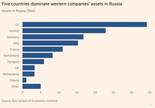 Aktíva západných spoločností v Rusku kontroluje päť krajín. Aktíva v Rusku (miliardy dolárov): USA, Rakúsko, Nemecko, Taliansko, Francúzsko, Švajčiarsko, Maďarsko, Spojené kráľovstvo, Holandsko, Poľsko, ďalšie krajiny.