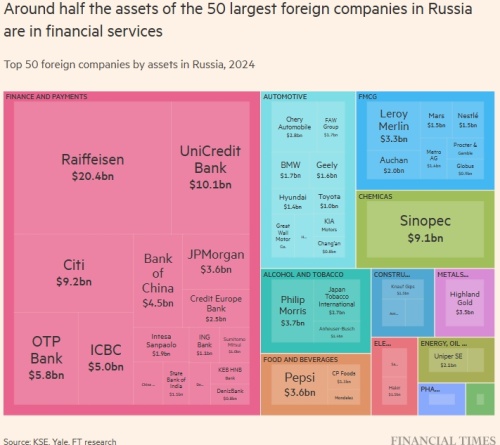 Podľa Kyjevského inštitútu ekonomickej školy sa celkové aktíva západných spoločností v Rusku odhadujú na najmenej 127 miliárd dolárov do roku 2024. Z nich 1 903 spoločností buď opustilo krajinu, alebo obmedzilo svoju činnosť od začiatku špeciálnej vojenskej operácie na Ukrajine pred takmer štyrmi rokmi. V Rusku však naďalej pôsobí 2 315 zahraničných spoločností.