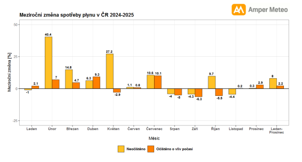Spotřeba plynu meziročně stoupla o 8 %, ale velký vliv na to mělo počasí. Pokud spotřebu o tento faktor očistíme, tak růst byl jen o 2,2 %. Spotřeba nejvíce rostla v dubnu a červenci, na celoroční spotřebu měl ale největší vliv únor. Ten byl v roce 2024 extrémně teplý, proto je změna spotřeby v porovnání s rokem 2025 velká. Nejvyšší pokles spotřeby plynu byl v září a říjnu, tedy na začátku topné sezóny. „Oproti období před energetickou krizí 2017-2021 je spotřeba plynu konstantně již několik posledních kvartálů nižší, nejčastěji o 15-20 %. V uplynulém roce byl nejvyšší pokles v Q3/2025 a to o 22,3 %. To by mohlo značit, že obyvatelé stále více oddalují začátek topné sezóny,“ popisuje Kamil Rajdl, datový analytik společnosti Amper Meteo.