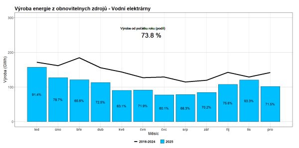 Výroba z vodních elektráren byla meziročně o 41 % nižší a oproti průměru 2016-2023 o 26,2 %. V žádném měsíci nebyla výroba vyšší než je průměr. Společně s rokem 2018 byla tato výroba historicky nejnižší (analyzováno 2016-2025). „Oproti minulému roku není překvapením, že výroba byla nižší, protože se tam projevily zářijové povodně i lednové tání sněhu, ale tak výrazný deficit oproti celému období 2016-2024, které bylo z velké části suché, značí významnost hydrologického sucha minulý rok. To je samozřejmě nebezpečné pro zajištění dodávek elektřiny v budoucnosti, protože vodní zdroje se stávají dosti variabilní a nespolehlivé,“ glosuje Kamil Rajdl.