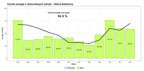 Větrné elektrárny v roce 2025 také moc nepřispěly k celkové výrobě elektřiny z OZE. Meziročně byla výroba nižší o 18 % a oproti období 2016-2024 o 5 %. Nejvíc výroby bývá v zimě, ale letos tomu tak nebylo. Větrné počasí naopak panovalo na podzim.