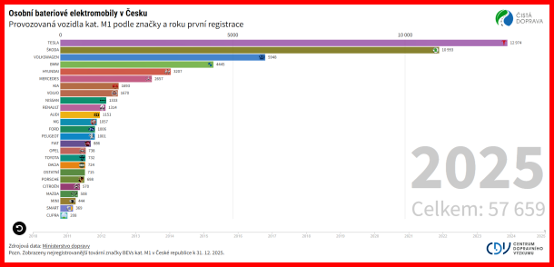 „Více než polovinu – konkrétně 51,9 % – provozovaných osobních bateriových elektromobilů v České republice dnes tvoří pouhé tři značky. V roce 2025 zaznamenala jednoznačně největší nárůst Škoda, která vloni registrovala 5,1 tisíce vozidel z celkových 11 tisíc. Naproti tomu dosavadní lídr segmentu, Tesla, s celkovým počtem zhruba 13 tisíc vozidel nedokázala navázat na mimořádně silný rok 2024 a v roce 2025 registrovala necelé dva tisíce vozidel. Volkswagen pak ve stejném období registroval přibližně 800 elektromobilů,“ uvádí ředitel Centra dopravního výzkumu Jindřich Frič.