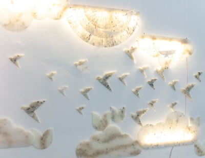 Plast zde nevystupuje jako neutrální hmota, ale jako aktivní materiál, který se proměňuje podle způsobu zpracování. V některých dílech působí klidně a soustředěně, připomíná kámen, sediment nebo krajinu, jinde je výrazný, sebevědomý a vizuálně energický. Barevnost, struktura i rytmus vrstev se pohybují mezi jemností a razancí, mezi řádem a pohybem. Moment překvapení – kdy materiál popře očekávání spojená se svým původem – patří k nejsilnějším aspektům výstavy.