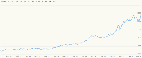 Výkonnost cen indexu Europe Total Market Aerospace & Defense za posledních pět let * Zdroj: Zoom