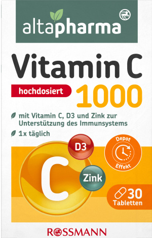 Altapharma Vitamin C 1000 je vysokodávkovaný doplněk stravy s promyšlenou kombinací vitaminu C, D3 a zinku, který účinně podporuje imunitní systém a přispívá k celkové obranyschopnosti organismu. Oblíbený vitamin C podporuje správnou funkci imunitního systému a chrání buňky před oxidačním stresem. Chybějící slunce snadno doplníte vitaminem D3, který je do zimních měsíců jako dělaný. Účinné látky se do organismu uvolňují postupně v průběhu několika hodin, takže jsou tělu k dispozici dlouhodobě a rovnoměrně po celý den.