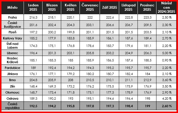 V lednu roku 2025 strávníci za oběd zaplatili v průměru 192,50 Kč. V prosinci 2025 to ale bylo až o 6,50 Kč více. Přestože tempo zdražování dlouhodobě zpomalilo, ceny poledního menu zůstávají pod tlakem. Jejich vývoj se navíc i nadále výrazně liší napříč krajskými městy. Praha si udržela nejvyšší cenovou hladinu – v prosinci zde oběd vyšel v průměru na 223,30 Kč. Na opačném konci žebříčku se dlouhodobě drží Zlín a Olomouc, kde se ceny obědů i v roce 2025 pohybovaly pod hranicí 180 Kč. Naopak nejnižší tempo zdražování loni zaznamenal Hradec Králové s necelým procentem růstu, a také Jihlava a Plzeň s 2,1% růstem.