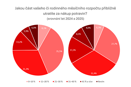 Změna souvisí i s tím, jak velkou část rozpočtu domácnosti vydávají za potraviny. Zatímco v roce 2024 utrácelo za jídlo více než 40 % svého rozpočtu necelých 6 % domácností, v roce 2025 už to bylo přes 8 %. Zároveň ubylo domácností, které se vešly do rozmezí 11–20 % rozpočtu – tedy skupiny, která byla ještě v roce 2024 nejsilněji zastoupena. Stále větší část lidí se naopak přesouvá do vyšších výdajových pásem, zejména do kategorie 21–30 % a 31–40 %. „Data potvrzují, že náklady na potraviny zabírají v rodinných rozpočtech čím dál větší prostor. Češi začali mnohem citlivěji vnímat, kolik je jídlo stojí. Restaurace navíc patří mezi první položky, které jsou lidé ochotni v rámci svých výdajů omezit – v roce 2025 to v našem průzkumu uvedlo téměř 90 % respondentů,“ doplňuje Aneta Martišková.