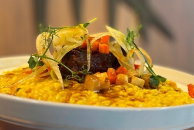 Hlavní chod patří pomalu taženému hovězímu na víně s krémovým šafránovým risottem, nechybí ani hravá burgerová variace inspirovaná salátem caprese.