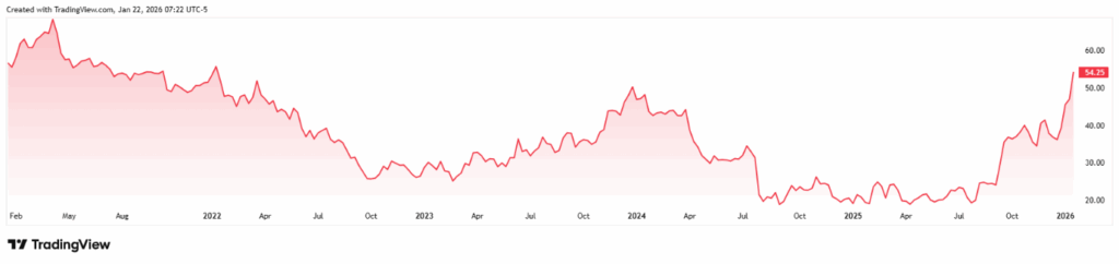 Hodnota akcií společnosti Intel ve středu 21. 1. 2026 vzrostla o 11 procent a uzavřela nad klíčovou technickou hranicí 54 USD.* Pro investory, kteří mají Intel ve svých portfoliích, jde o mimořádně důležitý moment, protože se jedná o nejvyšší cenu od ledna 2022. Stejně příznivý je i širší kontext, jelikož za posledních 12 měsíců si akcie připsaly téměř 150 procent a jen za rok 2025 vzrostly o více než 80 procent.*